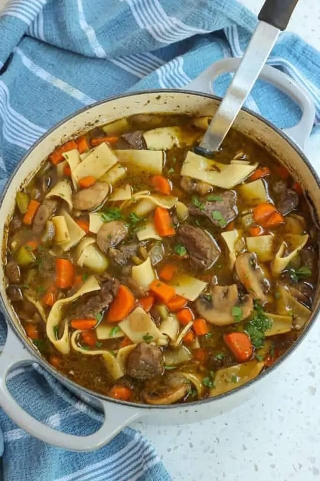 A deliciously simple Beef Noodle soup with succulent pieces of beef chuck roast, mushroom, onions, carrot, and egg noodles in a perfectly seasoned broth. This soup is the ultimate in fall and winter comfort food.
