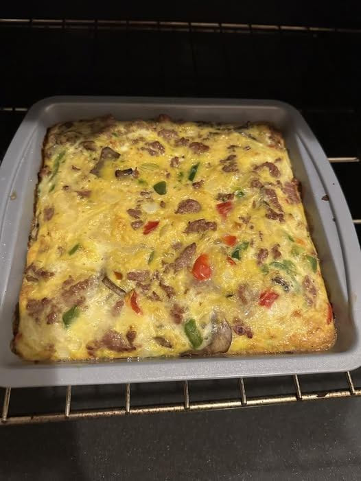 8 eggs whisked into a casserole dish Added cooked turkey breakfast sausage (here’s the points) Added sautéed mushrooms Added a bag of frozen peppers and onions (cooked in the skillet first) Baked for 35 minutes at 400. Voila!