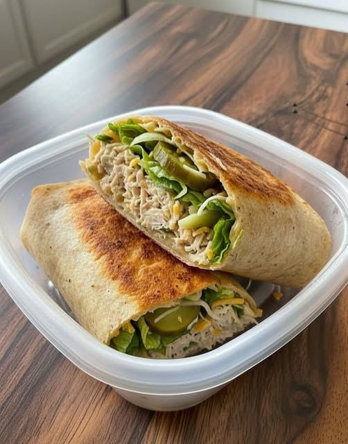 Mix ½ cup shredded chicken with 2 tbsp Greek yogurt ranch, garlic powder, and pepper. Add it into a low-carb tortilla with lettuce, diced pickles, and a sprinkle of cheese. Air fry until crisp. Every bite is crunchy, tangy, melty — like a healthier mode.