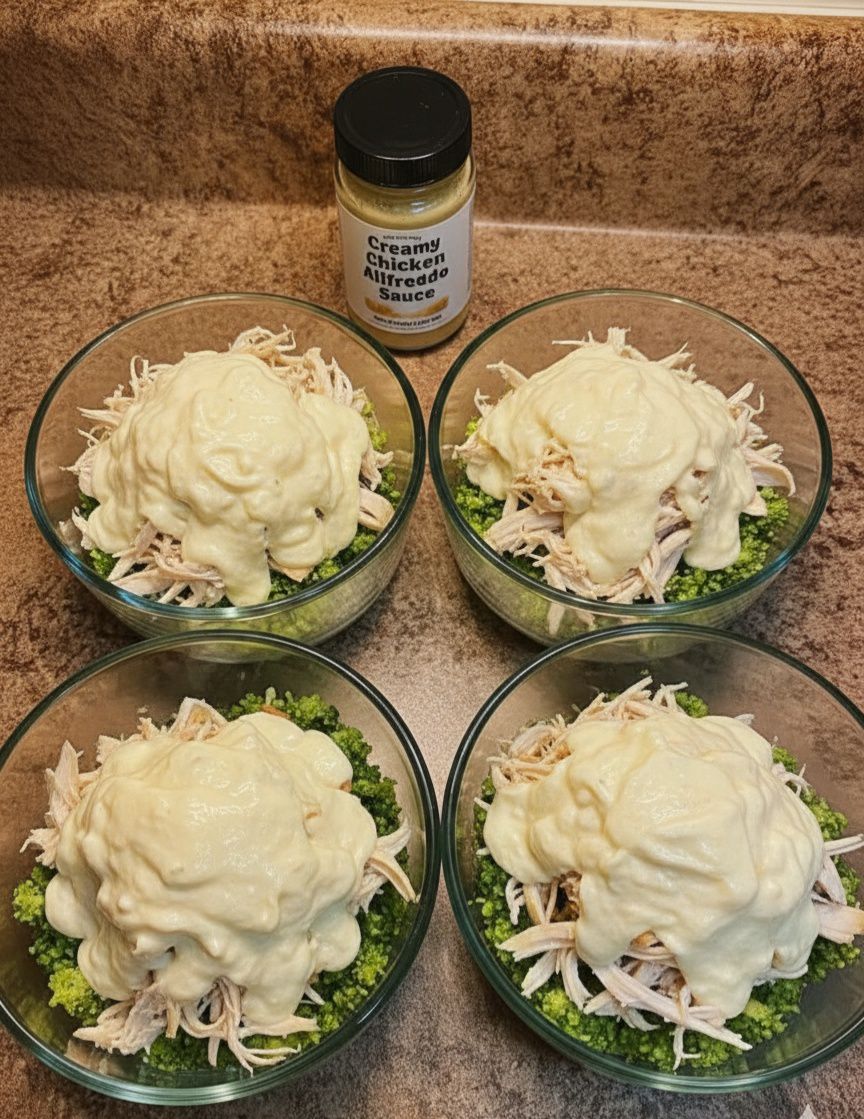 Pour over 1 cup shredded chicken and ½ cup steamed broccoli.