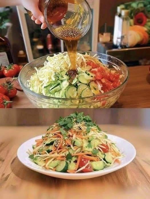 - Health Benefits: Cucumbers are hydrating and low in calories, while cabbage and carrots provide fiber and essential nutrients. This salad is an excellent source of vitamins C and K, promoting immunity and bone health.