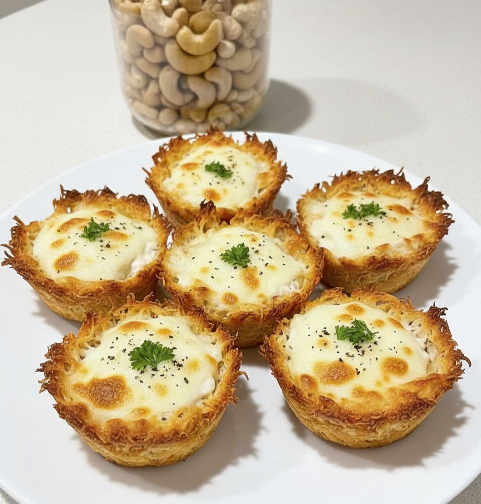 You mix shredded chicken, non-fat cottage cheese, parmesan, garlic, and one egg until it becomes a thick, scoopable dough. Press it into muffin tins to form “crusts,” then fill with a spoon of alfredo-style yogurt sauce and a little mozzarella. Bake until the edges turn golden and the centers bubble in the cutest creamy way. They come out looking like tiny savory pies — and honestly, after the first bite, you forget they’re even healthy because they taste like something a fancy café would serve.