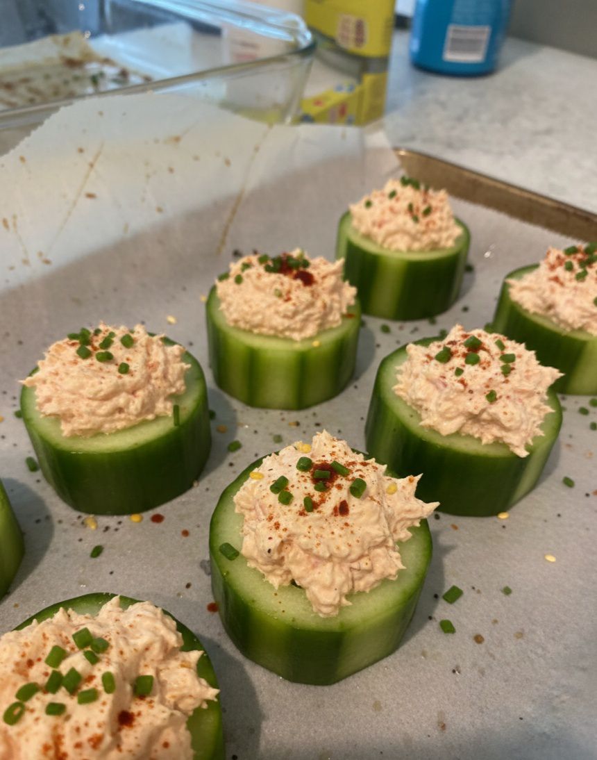 Finely shred ¾ cup cooked chicken breast. In a bowl, mix 2 tbsp Fage Total 0% Greek Yogurt, 1 tsp Frank’s RedHot, ½ tsp smoked paprika, and a pinch of salt. Stir in the chicken until it becomes creamy but fluffy. Spoon into mini cucumber cups or lettuce cups and chill for 5 minutes. The texture becomes light like a mousse, but the flavor hits spicy, smoky, and savoury — a new kind of protein snack that feels snacky, not like a meal.