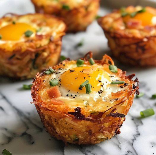 - Add the Eggs: Crack one egg into each hash brown cup, being careful not to break the yolk. If desired, sprinkle a little bit of cheese on top.