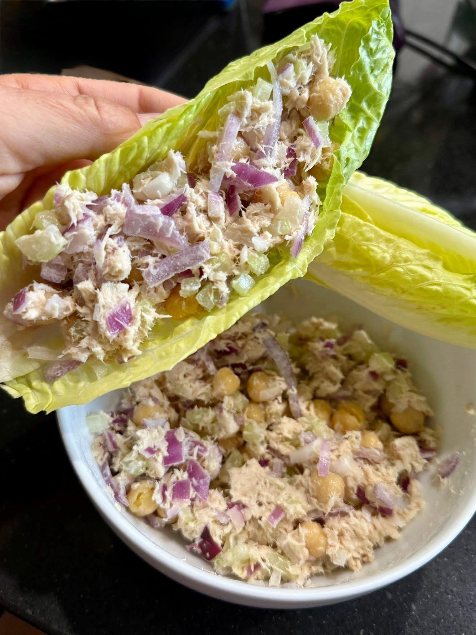 - Combine tuna, garbanzo beans, onion, celery, and Greek yogurt in a small bowl; season with salt and pepper.