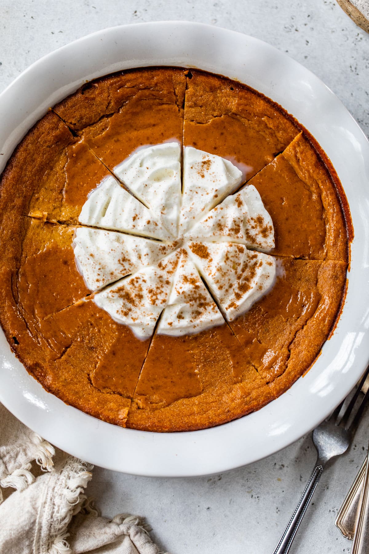 An easy recipe for a homemade crustless pumpkin pie.  This Zero Point Crustless Pumpkin Pie recipe is perfect for fall-it’s so good-you won’t regret making this for your next family gathering!